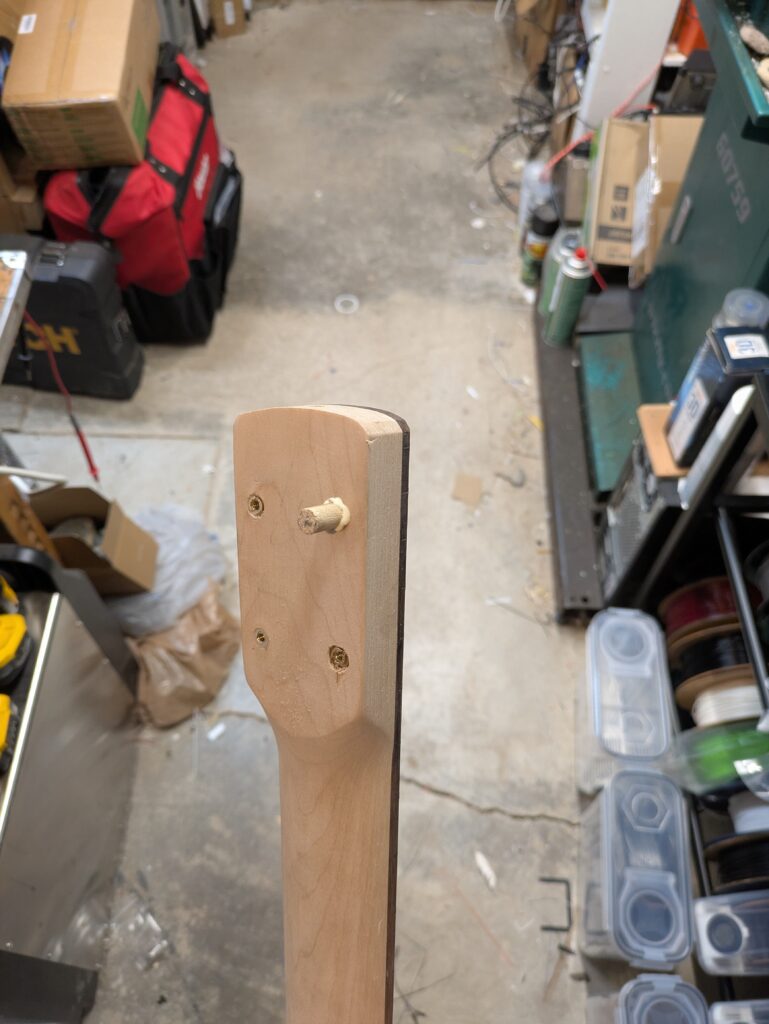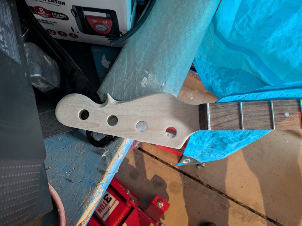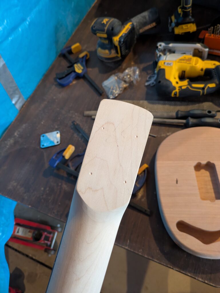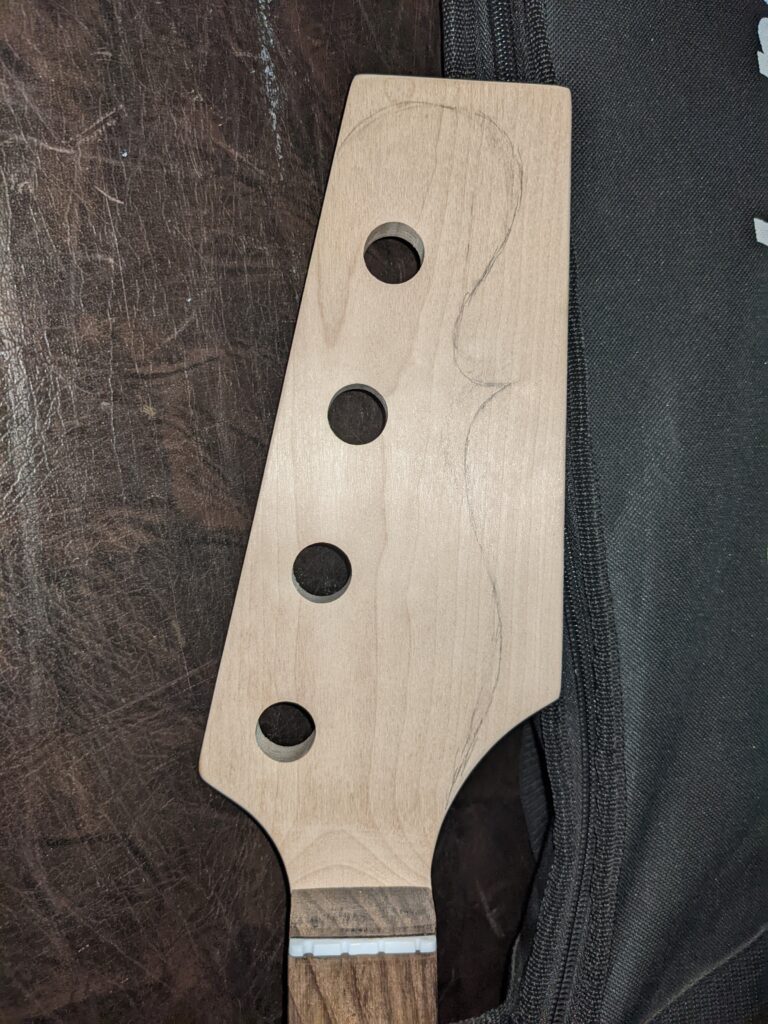 I was always a fan of the Music Man version of headstock that Jess Coss has on her guitar, so I cut and sanded: