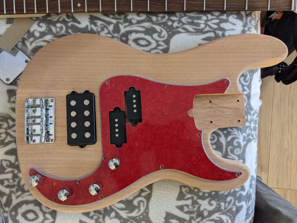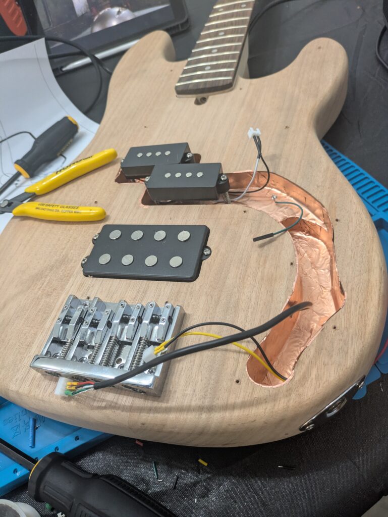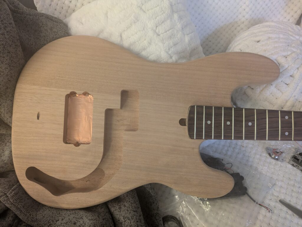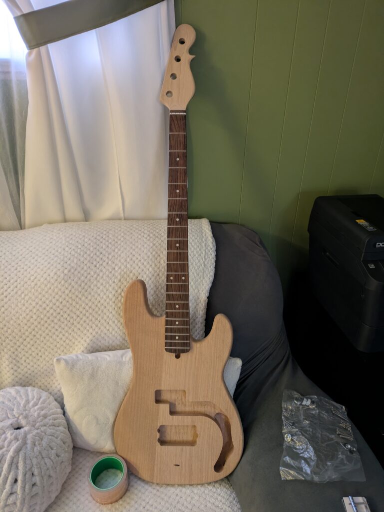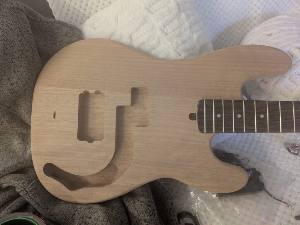 The next day it played very well. The sustain is very high compared to the old Guild Pilot even on its better days. The action feels good to play. The humbucker is boinky, and the split has a great full tone. The A and D are a bit quiet compared to the B and E strings, so I am hoping bringing the bottom split pickup closer will work. The fretboard and really all of the wood surface needs finishing, but I do want to do some lasering first. There is also fretwork and lots of sanding to do.