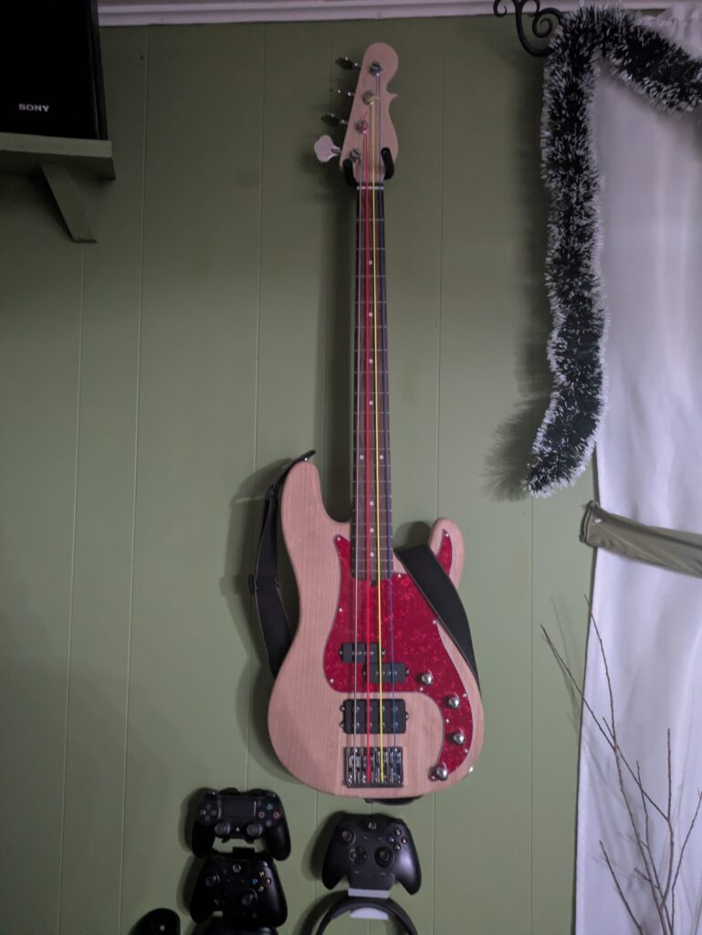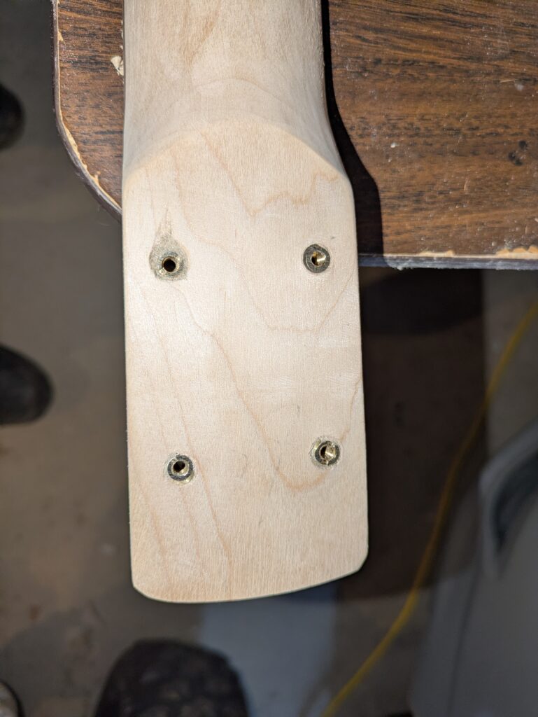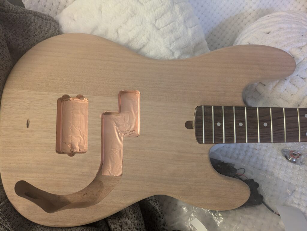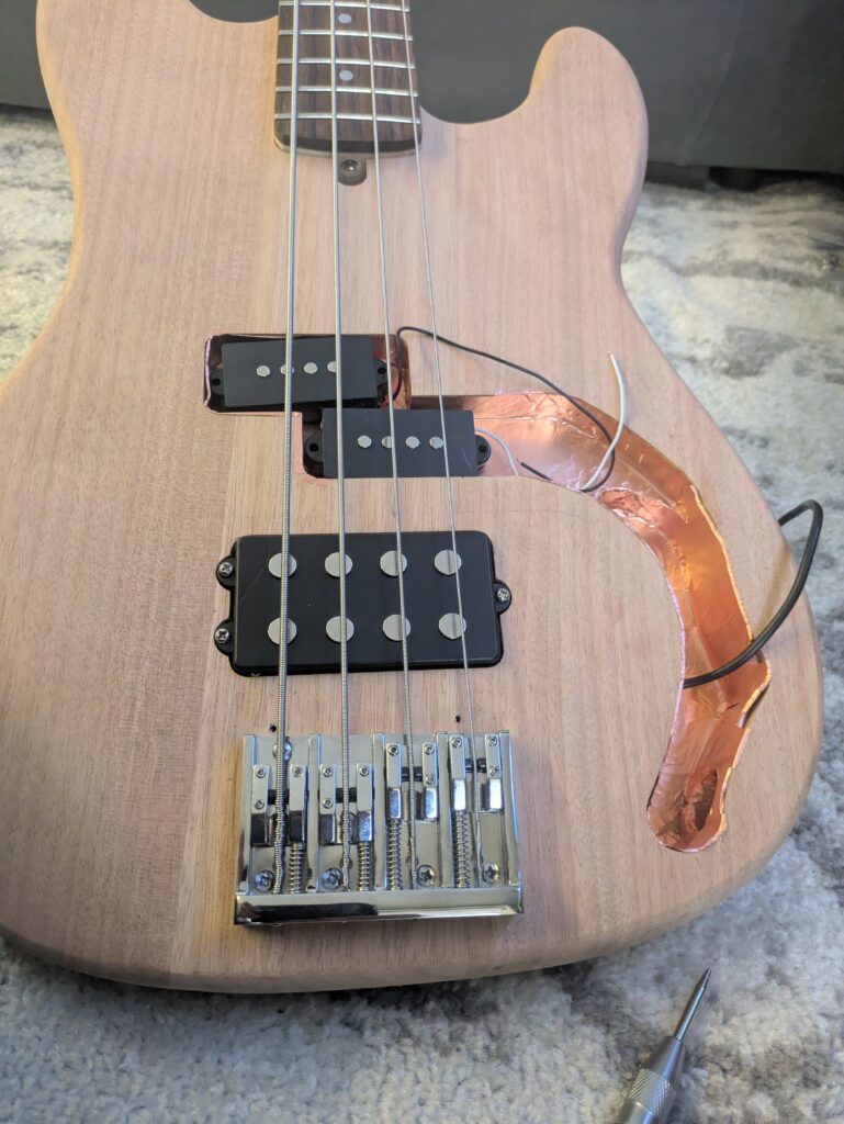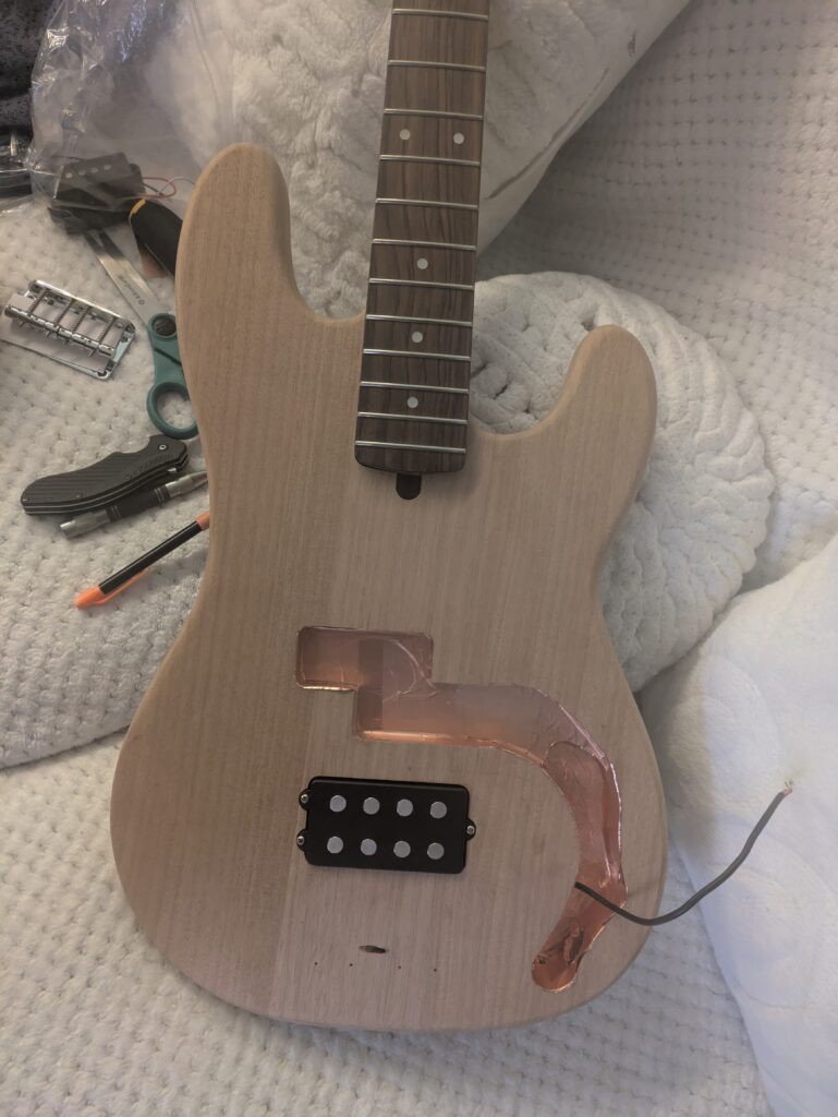 The next day it played very well. The sustain is very high compared to the old Guild Pilot even on its better days. The action feels good to play. The humbucker is boinky, and the split has a great full tone. The A and D are a bit quiet compared to the B and E strings, so I am hoping bringing the bottom split pickup closer will work. The fretboard and really all of the wood surface needs finishing, but I do want to do some lasering first. There is also fretwork and lots of sanding to do.