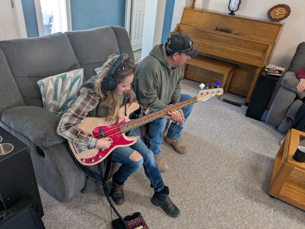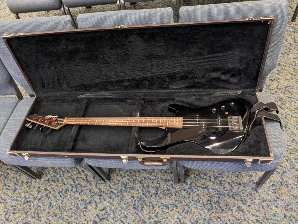Last Thursday while practicing, I tried playing a G on the E string and I got a dead note. I confirmed that no cords or clothing was deadening the strings, but nothing changed. It looked like the string was hitting the 4th fret so bad it didn’t buzz, it just killed the note. But when I pushed my thumb on the back of the neck I started to get some sound back. So I did what any reasonable musician would do and pulled the top of the headstock forward with about 10 pounds of pressure.