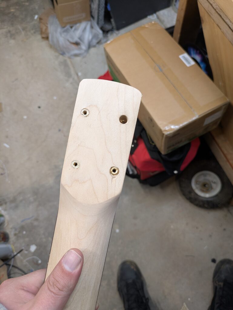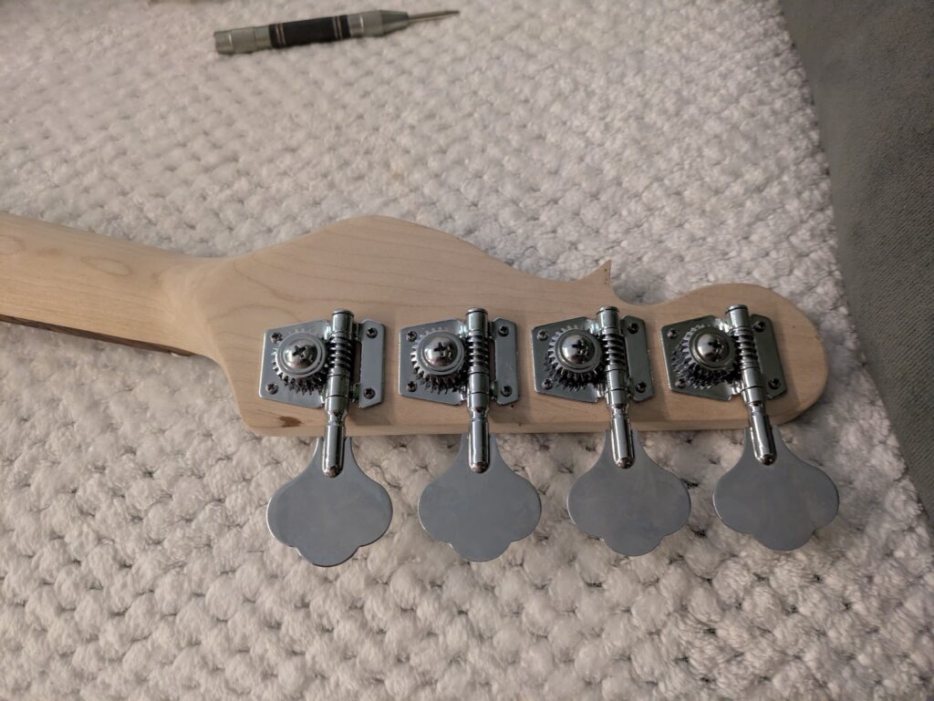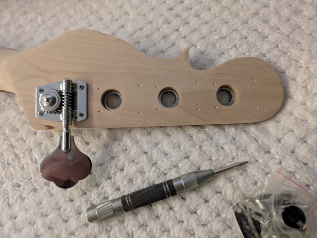 I used a center punch to mark out the tuners by eye. The wood didn’t seem to need pilot holes, and my available drills were too big for these screws in any case.